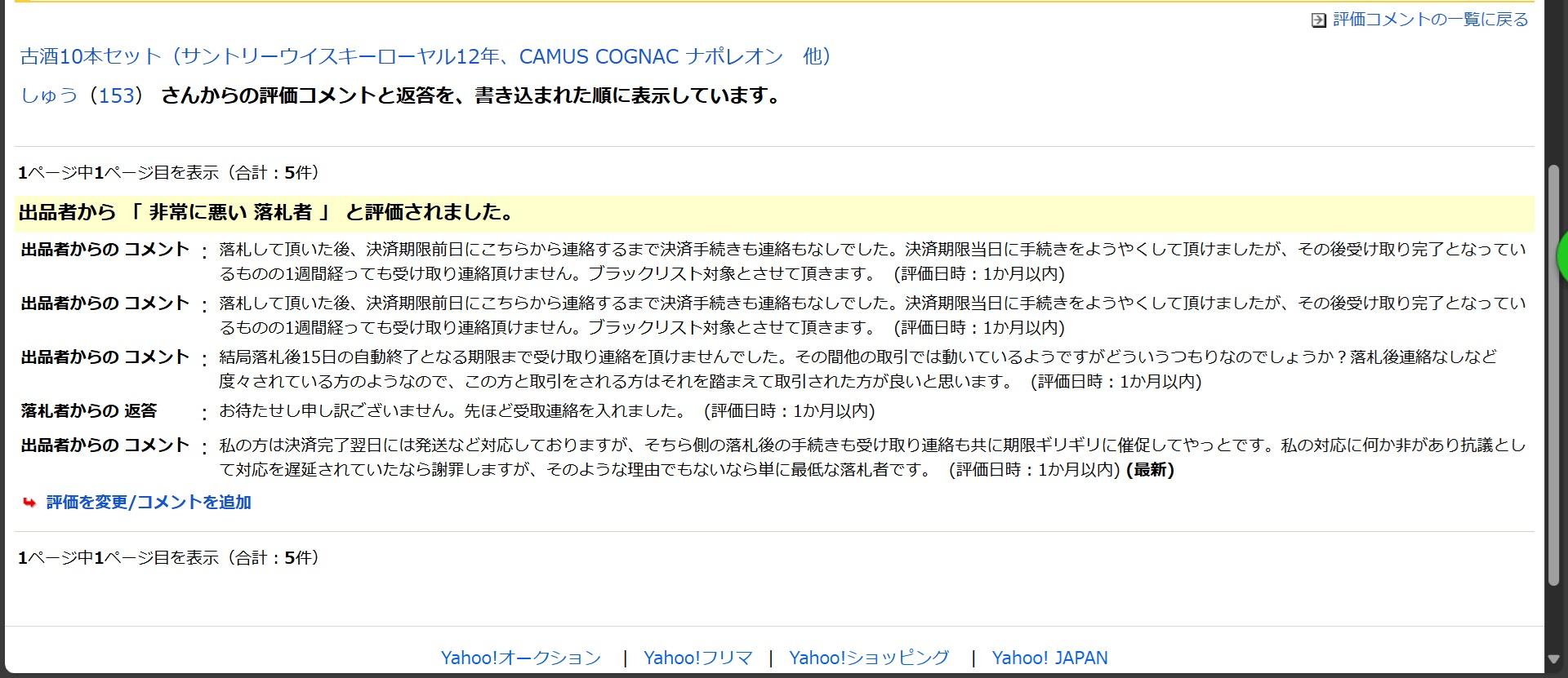 この間、相手の取引評価に2回ほど履歴が付いていたので他の取引活動をしていたようです。百歩譲って商品が不満などの理由があるならまだしも、商品が届く前の段階からこの対応の意味が分かりませんでした。ちなみに、その方の300件前後の取引中20件弱ほど同様の落札後連絡なしが評価で確認できました。